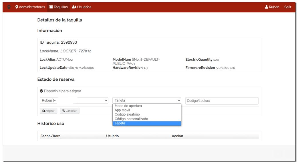 Panel web con asignación de taquilla